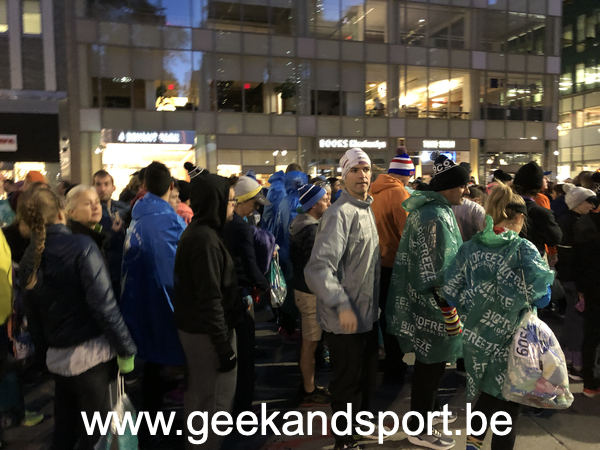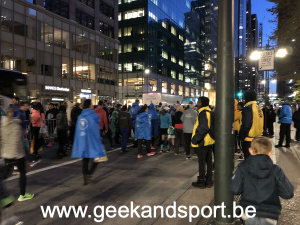 Une fois le réveil sonné, en quelques secondes tout le monde est prêt. J’ai opté pour un départ en bus (offert par l’organisation) au pied de la bibliothèque publique de New-York. Pour s’y rendre, il faut prendre le métro. On est donc quelques coureurs à attendre… à attendre… à attendre…. Les panneaux d’affichage annoncent les passages mais aucun métro ne passe… et personne à qui demander. Ni une, ni deux, on change de station.